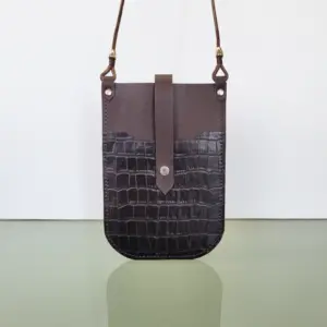 Tamamı titizlikle elde üretilmiştir. Birinci sınıf dana derisi kullanılmaktadır. Ürünümüzün ön ve arka tarafında yarım iki adet cep ve üst tarafı çıtçıtlı üç bölümü vardır. Çantanın ön cebinde desen baskılı deri kullanılmıştır. Sacci Mini Deri Telefon Çantası ebatları 13 x 19 cm’dir.